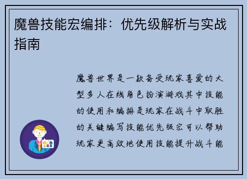 魔兽世界是一款备受玩家喜爱的大型多人在线角色扮演游戏,其中技能的使用和编排是玩家在战斗中取胜的关键。编写技能优先级宏可以帮助玩家更高效地使用技能,提升战斗能力。本文将详细介绍魔兽如何编技能优先级的宏,...